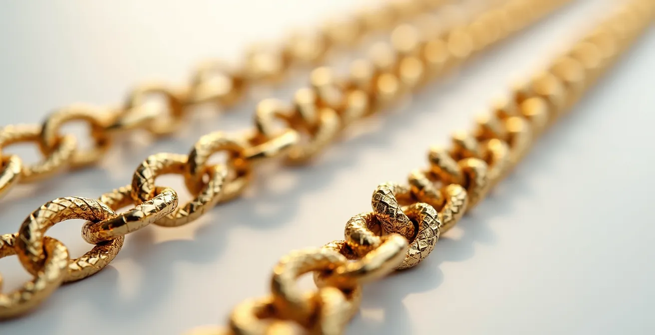 Ein breites, voluminöses Kettendesign kann beeindrucken, doch der Schein trügt oft. Viele solcher Schmuckstücke sind aus hohlem Gold gefertigt, um Material zu sparen und den Preis zu senken. Das Problem: Diese Ketten sind extrem anfällig für Dellen und Verformungen. Ein unachtsamer Stoss genügt, und die Kette hat eine permanente Beule, die nicht mehr zu entfernen ist. Ein massives Goldstück hingegen besitzt eine hohe Dichte und Formstabilität. Es fühlt sich wertig an und verzeiht auch mal einen Stoss.